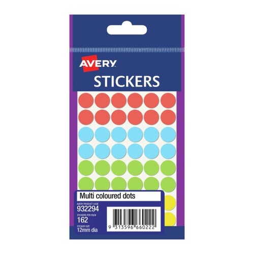 Avery Assorted Dots 12mm Pk162 Bx10 are a convenient way to label all sorts of different items quickly and easily. Hand writeable with permanent adhesive. Available in resealable handipacks.