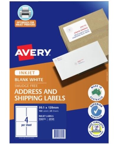 Avery Ship Label Inkjet 99.1x139 J8169 4UP Pk25 are great for addressing your parcels, boxes and mailing tubes. They completely covers old information allowing you to reuse packaging. The adhesive is designed to stay securely on your packages.