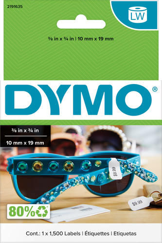 Dymo LW Price Tag Jewelry Labels 2UP 1500 Labels has a combination of adhesive and non-adhesive label sections to provide flexibility to label a variety of items, including jewelry, eyewear, pens, pencils, and more.
