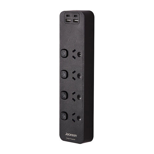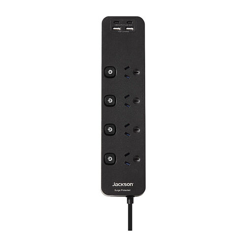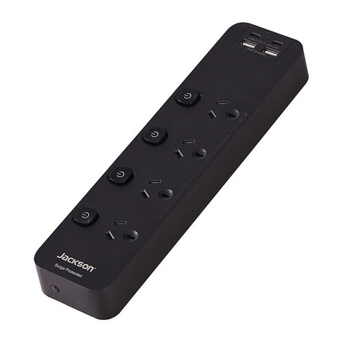 Jackson Fast Charge USB-C Powerboard - Switched 4 Outlet features surge protection of up to 175J to protect your appliances and devices from unexpected power surges. Fast charges up to 4 devices at once using the USB-C and USB-A charge ports.